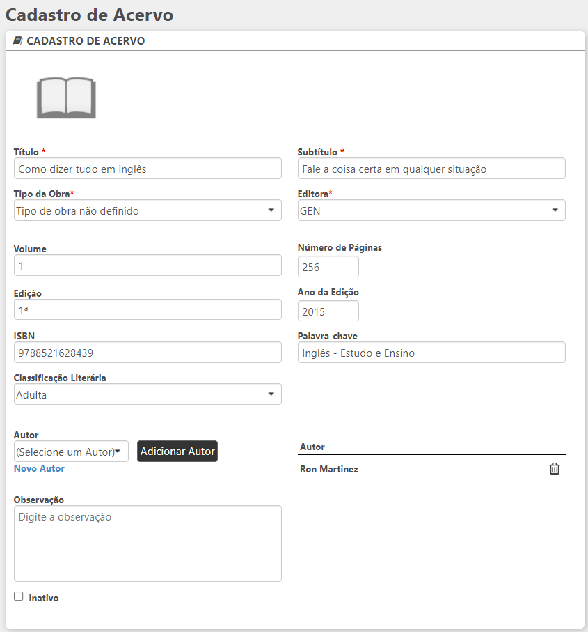 - Opção Inativo: ao selecionar esta opção o livro cadastrado ficará com situação inativa.
