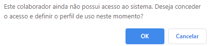 Ao clicar em OK o usuário será direcionado para a rotina de cadastro de usuário e caso clique em Cancelar o cadastro do novo colaborador será salvo e uma mensagem se sucesso será exibida. Para mais informações sobre o cadastro de usuário clique aqui.