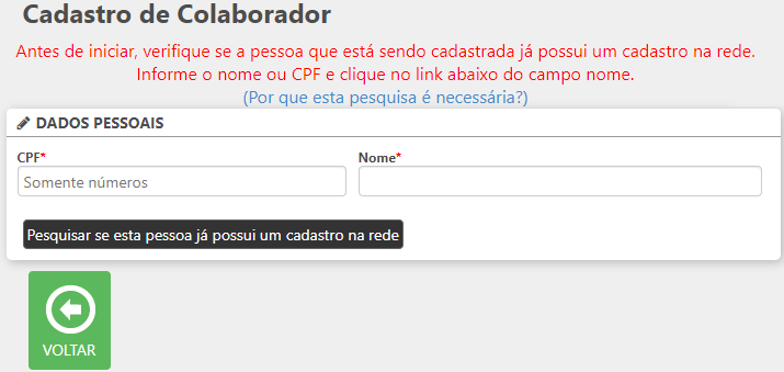 Ao clicar neste botão o usuário será direcionado para a rotina de Cadastro de Colaborador. Será necessário realizar uma pesquisa para verificar se a pessoa já possui um cadastro, esta pesquisa deve ser realizada por nome e CPF. Ao preencher os campos clique em Pesquisar se esta pessoa já possui um cadastro na rede.