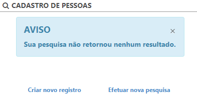 Ao realizar a pesquisa será exibida uma janela com o resultado, caso a pessoa já possua cadastro será exibido um campo com a opção do cadastro existente. Para realizar uma nova pesquisa clique no link Efetuar nova pesquisa e para fazer um novo cadastro clique Criar novo registro.