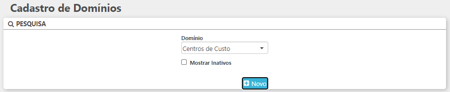 Para utilizar a rotina acesse menu Domínios > Cadastrar Domínios. No campo de "Domínio" selecione a opção "Centros de Custo".