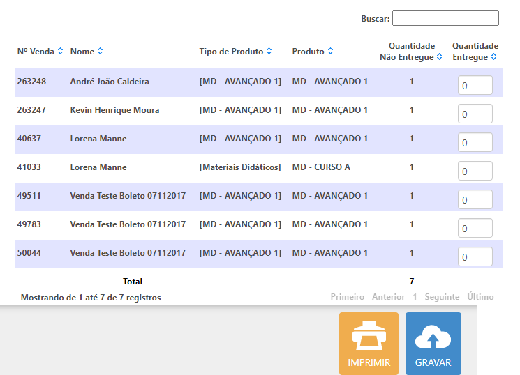 Após editar a quantidade de materiais entregues, basta clicar em "Gravar". É possível imprimir a listagem do resultado clicando em "Imprimir".