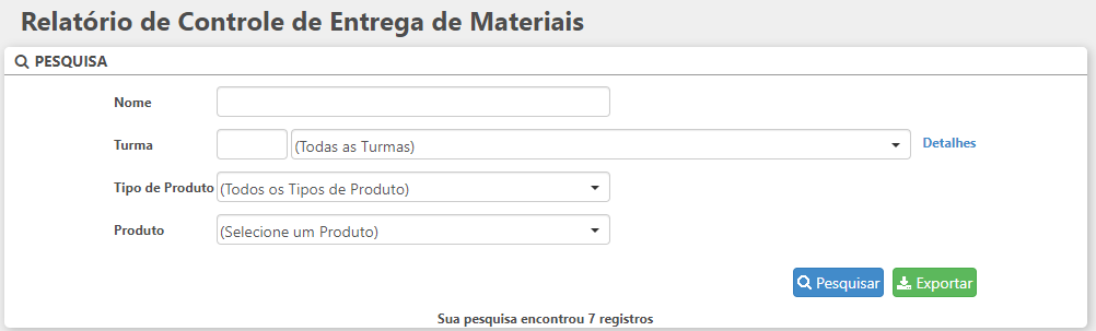 Para visualizar esta rotina acesse menu Relatórios > Administrativo > Controle Entrega Material. Ao abrir a rotina, será possível realizar uma pesquisa das turmas para definir o controle de entrega dos materiais de cada uma. Para realizar a pesquisa, o usuário pode estar inserindo as seguintes informações: