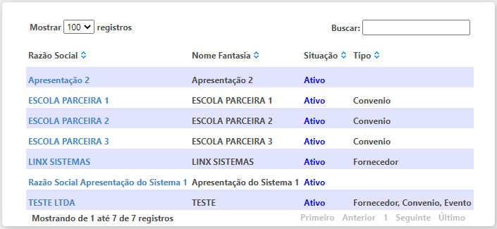• Razão Social: para acessar o cadastro da empresa clique no link desta coluna;