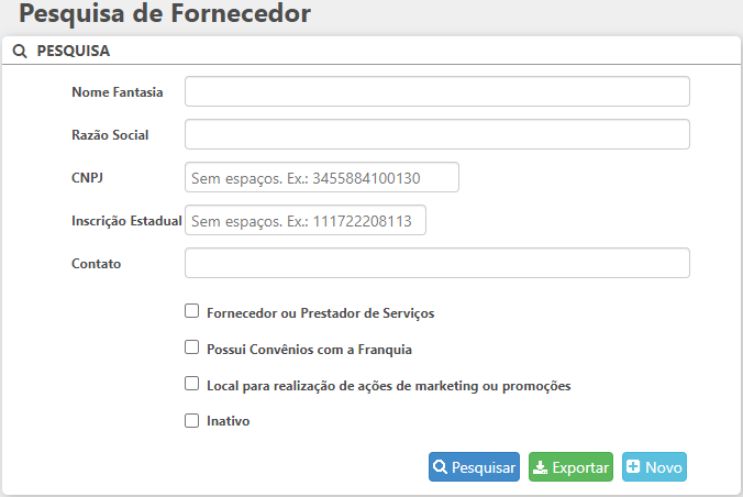 • Botão Novo: por meio deste botão é possível realizar novos cadastros de fornecedores ou prestadores de serviços.