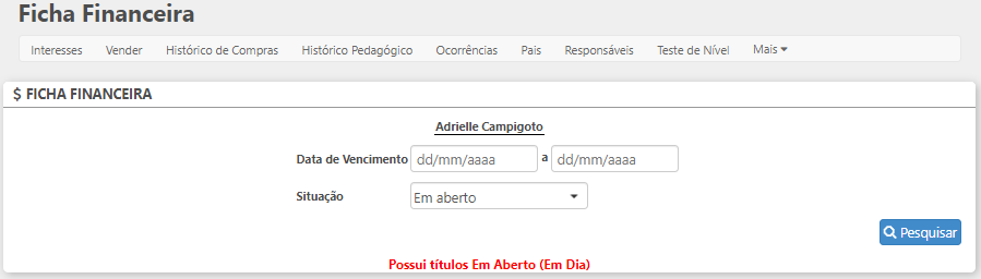 Ao clicar em Pesquisar serão exibidas as fichas financeiras geradas no cadastro do aluno.