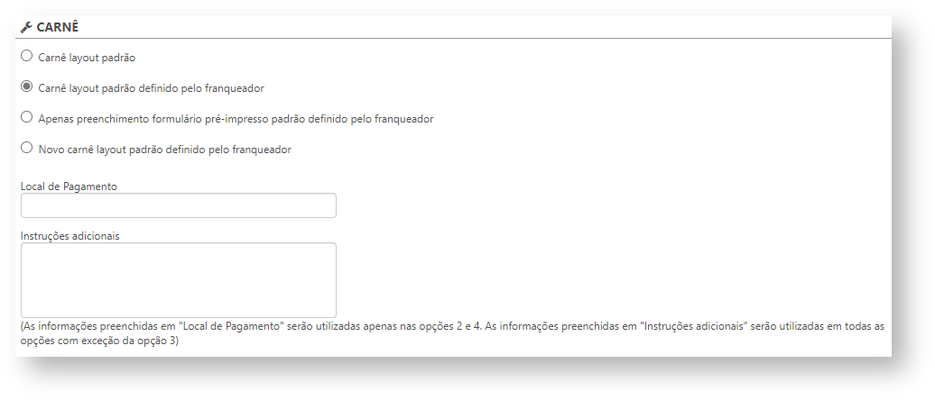 - Carnê layout padrão definido pelo franqueador: marcando esta opção, o layout padrão do carnê será o definido pelo franqueador;