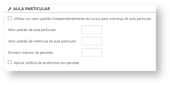 - Utilizar um valor padrão (independentemente do curso) para cobrança de aula particular: marcando esta opção, será utilizado um valor padrão para cobrança de uma aula particular, independente do curso;