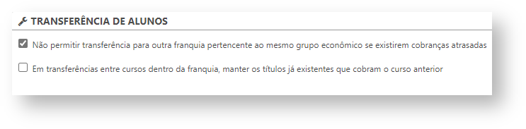 - Não permitir transferência para outra franquia pertencente ao mesmo grupo econômico se existirem cobranças atrasadas: marcando esta opção, não será permitida a transferência de um aluno para outra franquia caso exista cobranças atrasadas em seu cadastro;