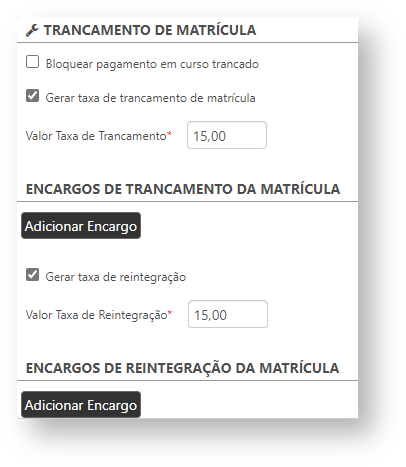 - Gerar taxa de reintegração: marcando esta opção, será permitido gerar uma taxa de reintegração, para quando o aluno trancar o curso e retornar;
