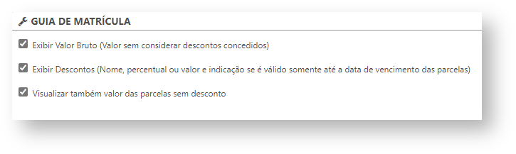 - Exibir Valor Bruto (Valor sem considerar descontos concedidos): marcando esta opção, será exibido somente o valor bruto na guia de matrícula, sem exibir outros valores como descontos;