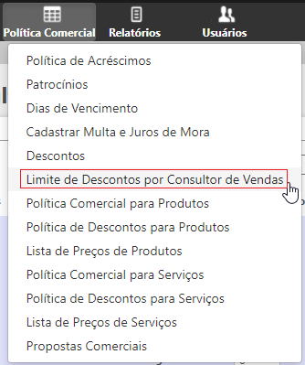 Para acessar esta rotina é necessário que a permissão Limite de Descontos por Consultor de Vendas esteja habilitada em Menu Usuários > Consultar Usuários > Pesquisar o usuário > Link do cadastro de usuário.