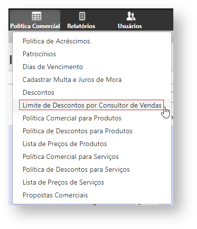 Para acessar esta rotina é necessário que a permissão Limite de Descontos por Consultor de Vendas esteja habilitada em Menu Usuários > Consultar Usuários > Pesquisar o usuário > Link do cadastro de usuário.