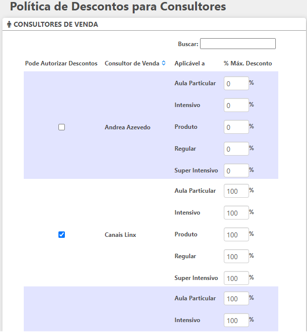 Nesta rotina é realizada a configuração de percentual de desconto que cada colaborador pode conceder para os cursos por modalidades.