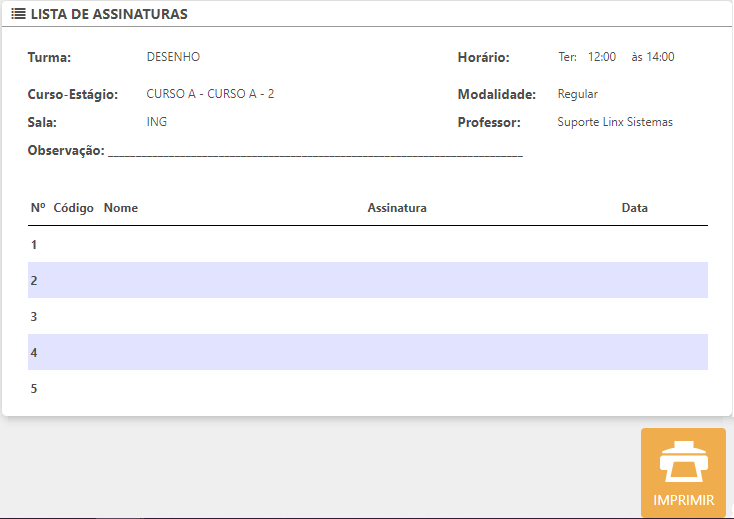 Nesta rotina é gerada a listagem de assinaturas para registro de presença manuscrito nas aulas.