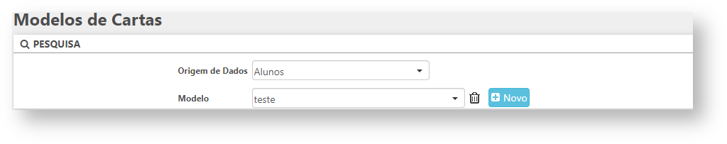 Para utilizar a rotina acesse menu Parâmetros > Modelos de Cartas. Ao abrir a rotina, será necessário selecionar uma opção no campo "Origem de Dados". Em seguida, será exibido o campo "Modelo".