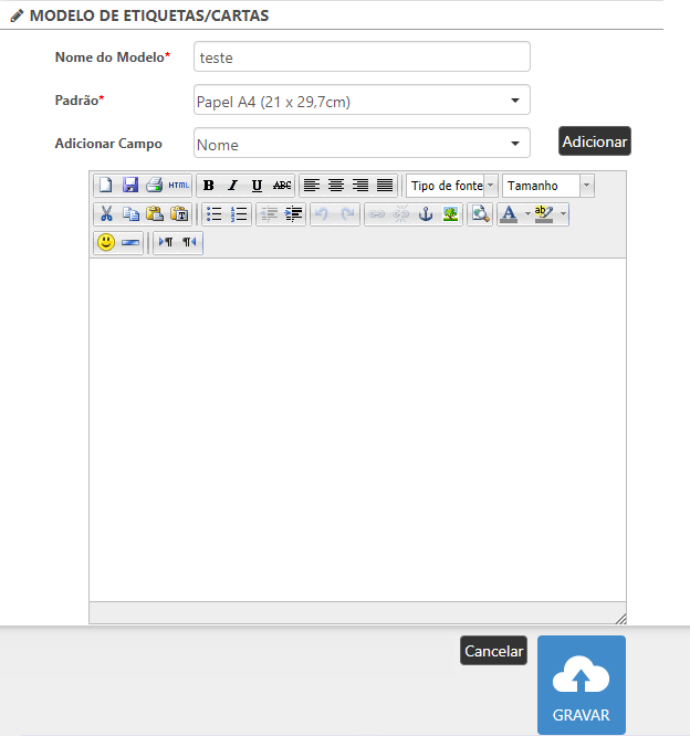 Após definir o modelo de cartas, basta salvá-lo em "Gravar". Ele ficará salvo e poderá ser selecionado sem precisar escrevê-lo novamente. Caso queira criar um novo modelo de carta, basta selecionar .