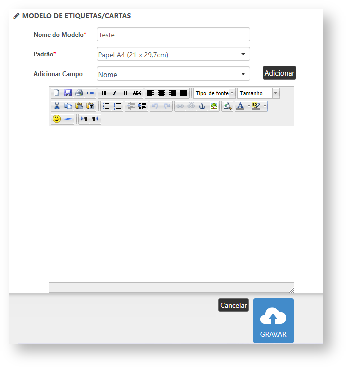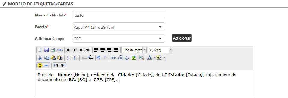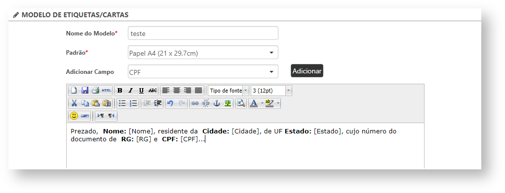 Ao selecionar o modelo será exibido o grupo de "Modelo de Etiquetas/Cartas". Para configurar o modelo de carta deve ser preenchido o campo "Nome do Modelo", com o nome que deseja atribuir à carta, e selecionar o padrão de papel para impressão no campo "Padrão". Após isso, o usuário poderá inserir o texto que contemplará no modelo da carta e selecionar as informações que serão apresentados pelo campo "Adicionar Campo".
