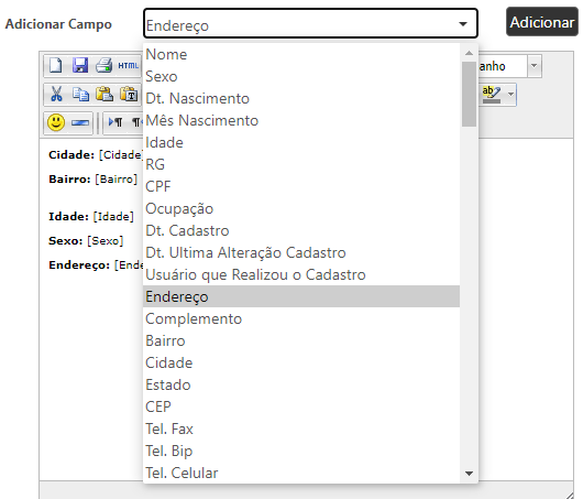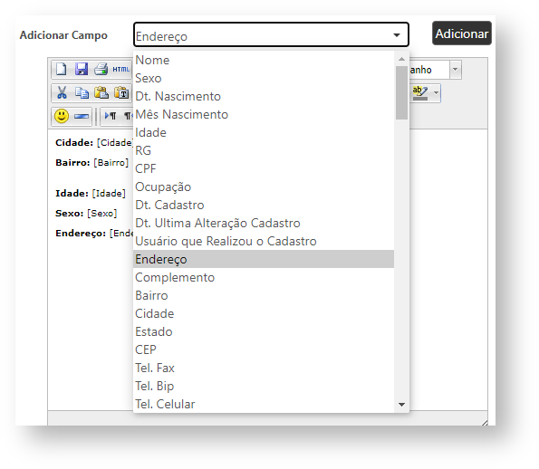 Selecionando os campos desejados e clicando em "Adicionar", eles vão sendo exibidos no espaço de edição em branco.