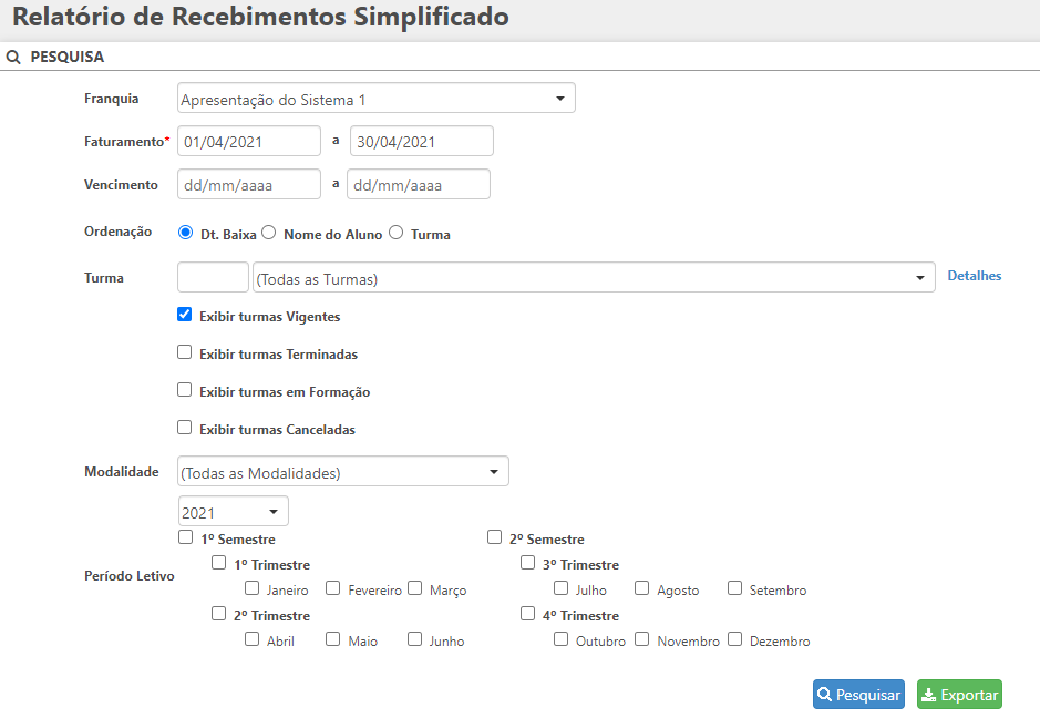 - Período Letivo: permite selecionar o ano letivo no campo e selecionar os semestres e meses que deseja buscar na listagem;