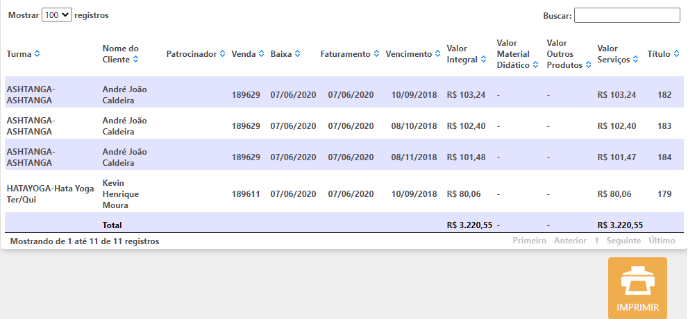 No resultado da pesquisa serão exibidos todos os recebimentos de faturas de acordo com os filtros definidos. Para imprimir o relatório basta selecionar "Imprimir".