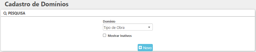 - Mostrar Inativos: permite exibir os cadastros do domínio "Tipos de Obra" que estão inativos;