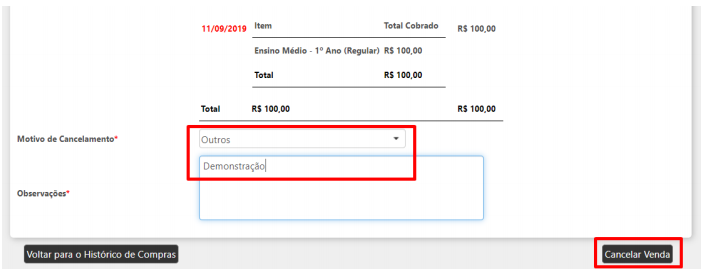 Selecione o motivo do cancelamento e Clique em “Cancelar Venda”: