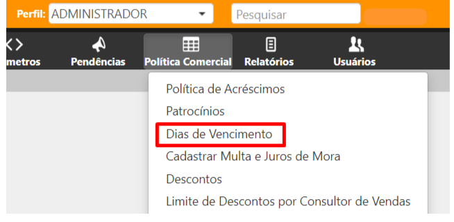 Acesse: Perfil Administrador > Política Comercial > Dias de Vencimento: