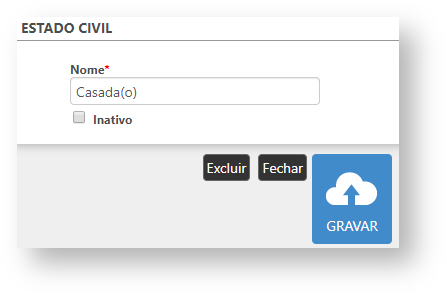 O cadastro de um novo estado civil é realizado através do botão Novo, ao acessá-lo será exibida uma janela para que seja definido o nome. Para editá-lo basta clicar sobre o link do nome do registro, poderão ser modificados os seguintes campos: