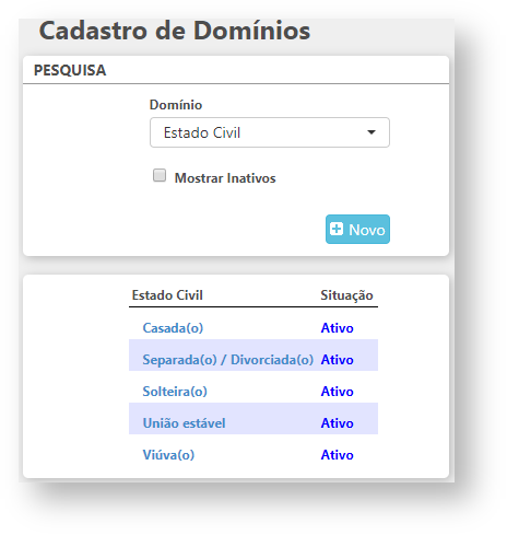 Ao selecionar o domínio será exibida uma listagem com todos os cadastros realizados, nesta lista será informado o nome do estado civil e sua situação.