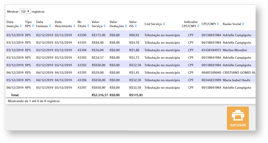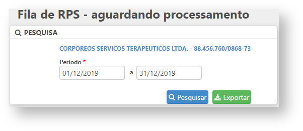 Ao inserir o período e pesquisar será exibida uma listagem contendo todas as RPS que aguardam processamento e se encaixaram no filtro determinado.