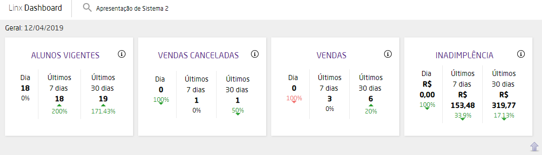 Ao acessar o Linx Ensino será apresentado o Dashboard na tela inicial, nele serão apresentados os seguintes indicadores: