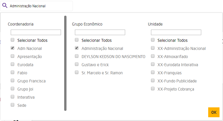 Nesta tela estará disponível um recurso para pesquisa, onde será possível detalhar a coordenadoria, o grupo econômico e a unidade desejada. Para realizar uma pesquisa clique no ícone da lupa "", ao clicar neste ícone será exibido o grupo Coordenadoria,após selecionar a opção deseja será exibido o Grupo Econômico e assim por diante. As informações exibidas nestes grupos respeitarão a permissão de usuário anteriormente configurada, exibindo somente opções em que o usuário possui acesso/permissão.