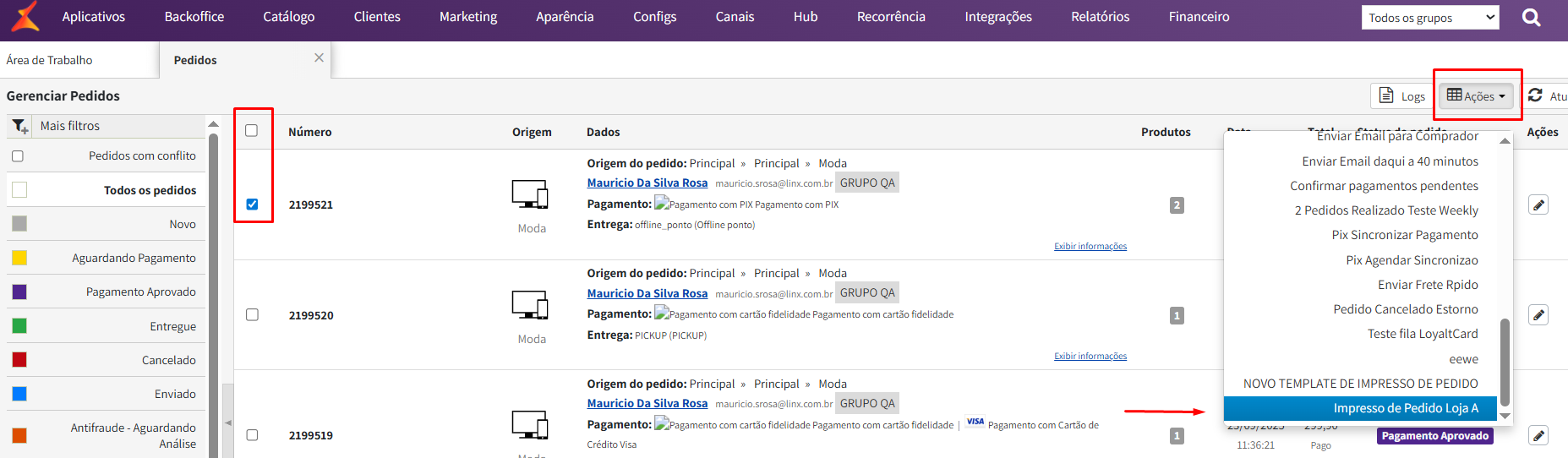- Backoffice → Pedidos → Selecione todos os pedidos ou marque o pedido a ser impresso → Ações → Selecione o template a ser impresso.