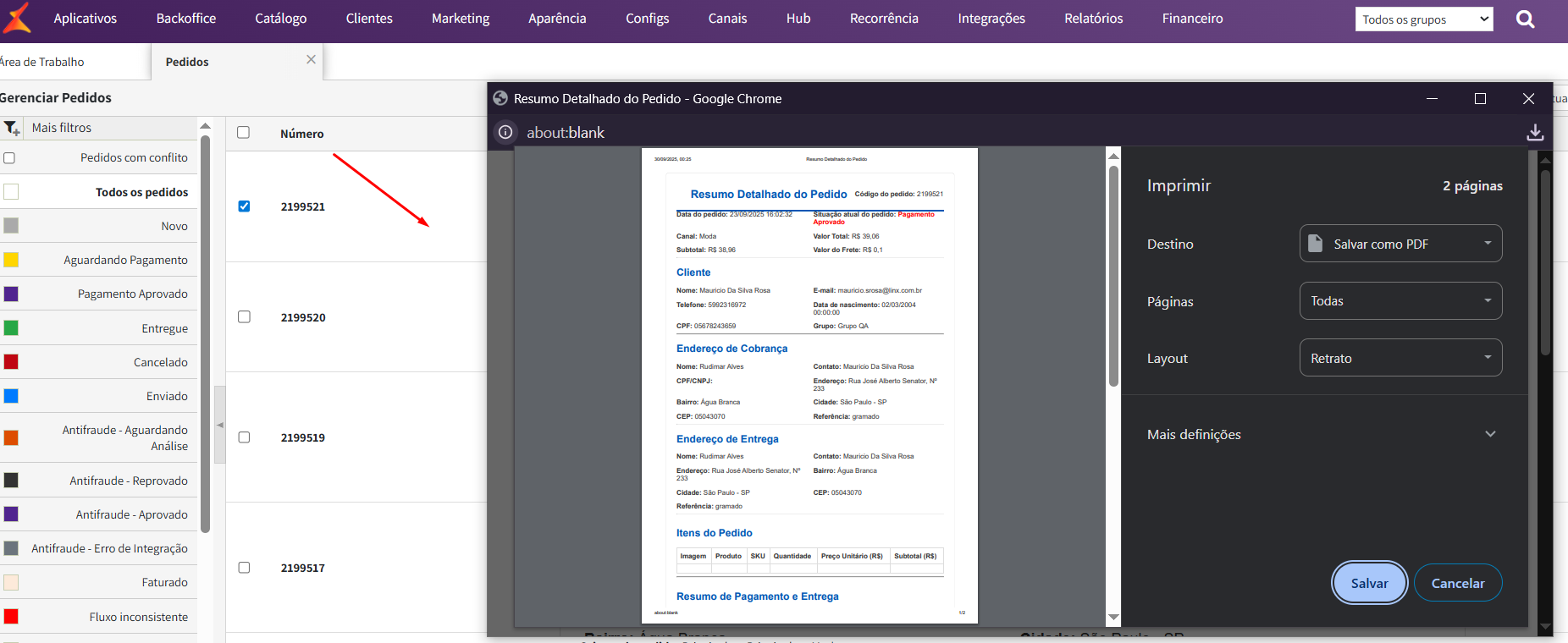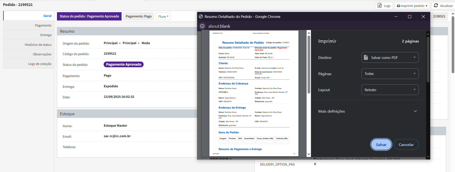 - Será aberto um preview, carregando não apenas o pedido, mas também impressora e ação a ser realizada (Salvar para impressora PDF ou Imprimir para de mais impressoras). Selecione a ação!