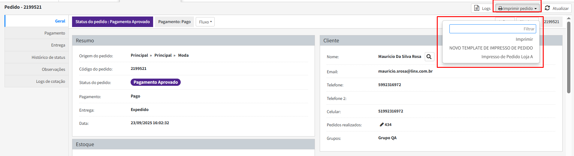 Impressão via detalhe de pedidos: