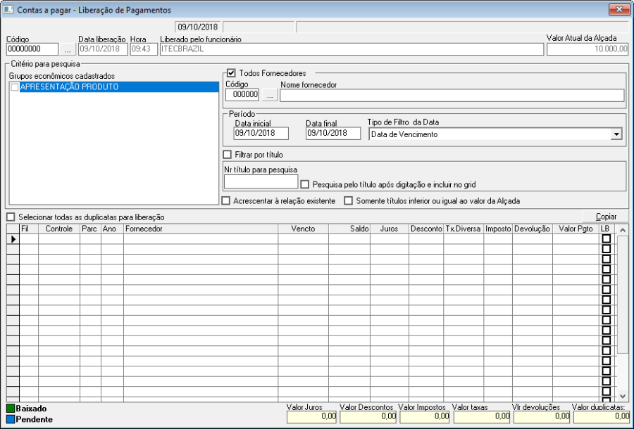 1.3 Pressione F6 para consultar as duplicatas pendentes de liberação;