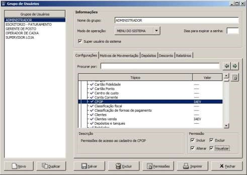 As permissões de acesso podem ser liberadas ou restritas de acordo com as políticas da empresa e seus respectivos grupos de usuários. Para configurar as permissões de usuário acessar Configurações > Usuários > Grupos de Usuários > aba Configurações, a seguir lista das permissões disponíveis: