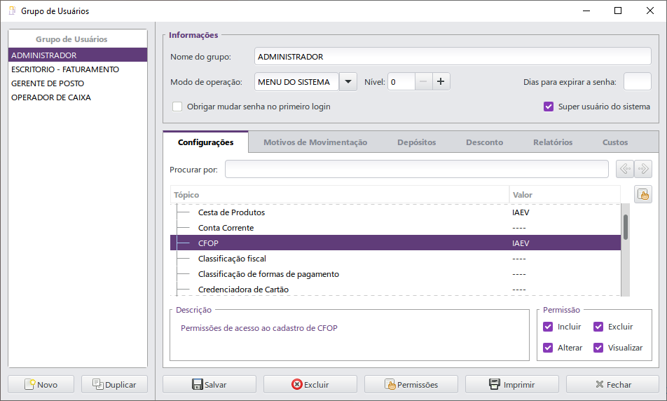 As permissões de acesso podem ser liberadas ou restritas de acordo com as políticas da empresa e seus respectivos grupos de usuários. Para configurar as permissões de usuário acessar Configurações > Usuários > Grupos de Usuários > aba Configurações, a seguir lista das permissões disponíveis: