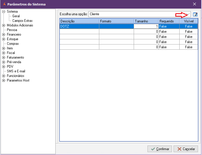 Parâmetro de SistemaEm parâmetros de sistema deve-se configurar o campo extra > DOTZ. Este mesmo campo ficará visível e necessariamente será preenchido na tela de cadastro do cliente. É este campo que define qual cliente participa do programa de fidelização DOTZ.
