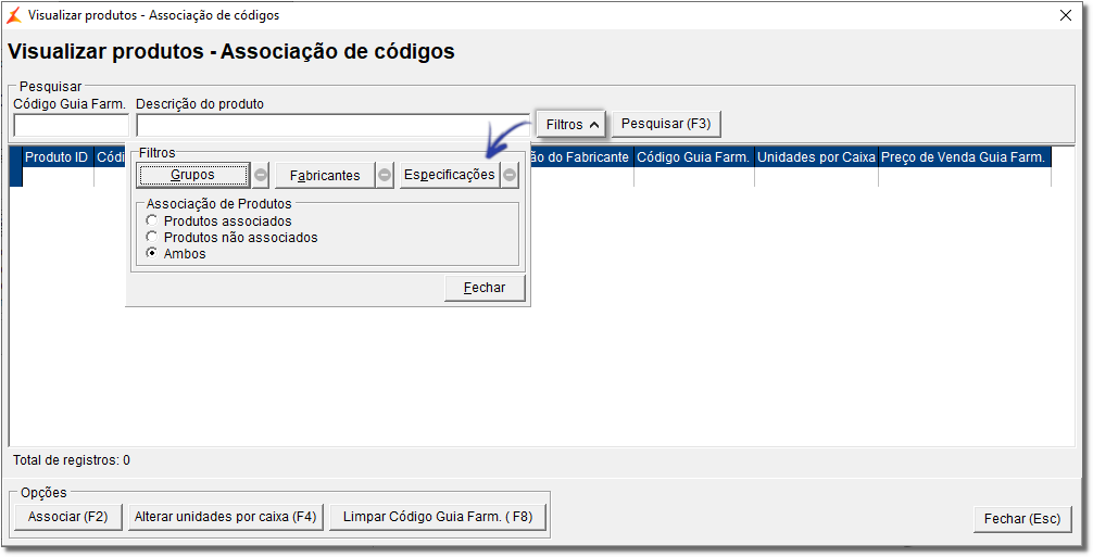 Caso seja necessário é possível consultar (visualizar) os produtos associados ou então associar manualmente os produtos que ainda não foram associados.