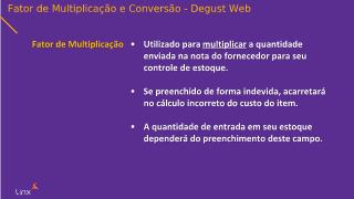 Exemplo Fator Multiplicador (FM): Recebo a mercadoria do meu fornecedor em fardos, porém faço o controle do meu estoque em unidades, sei que cada fardo recebido contém 6 unidades, sendo assim meu fator de multiplicação deve ser 6, ou seja, cada fardo será multiplicado por 6 para ser feito a entrada correta no meu estoque.