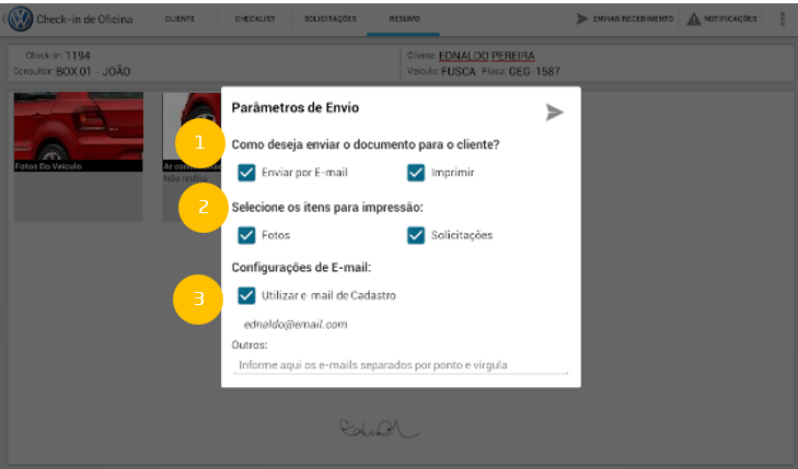 Para finalizar o envio basta tocar no ícone . Neste momento o sistema fará a gravação final de todos os dados no DMS. Durante este processo, caso o usuário tenha selecionado a opção "Imprimir", abrirá uma tela com as opções de impressão. Após este processo o checkin é finalizado.