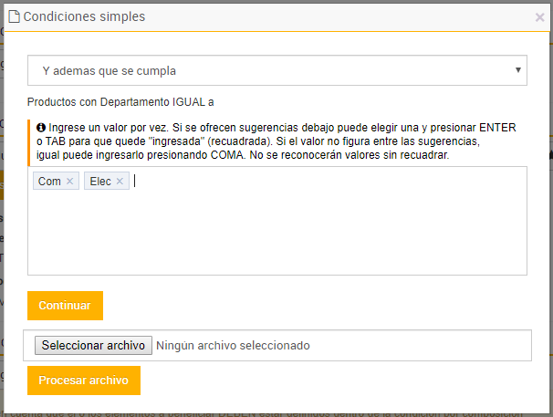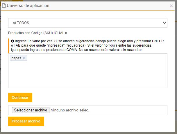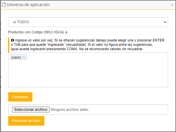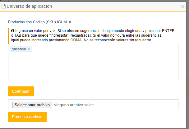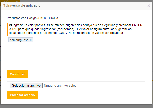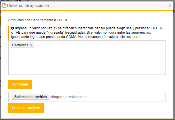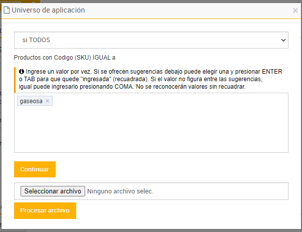 Al definir el Universo de Aplicación del beneficio en el caso de que se agregue más de un atributo (atributos son por ej: Código, Precio unitario, Marca, etc).