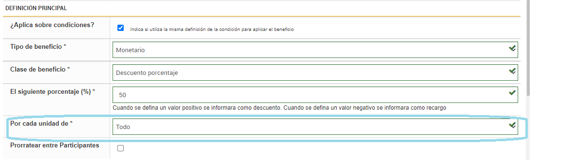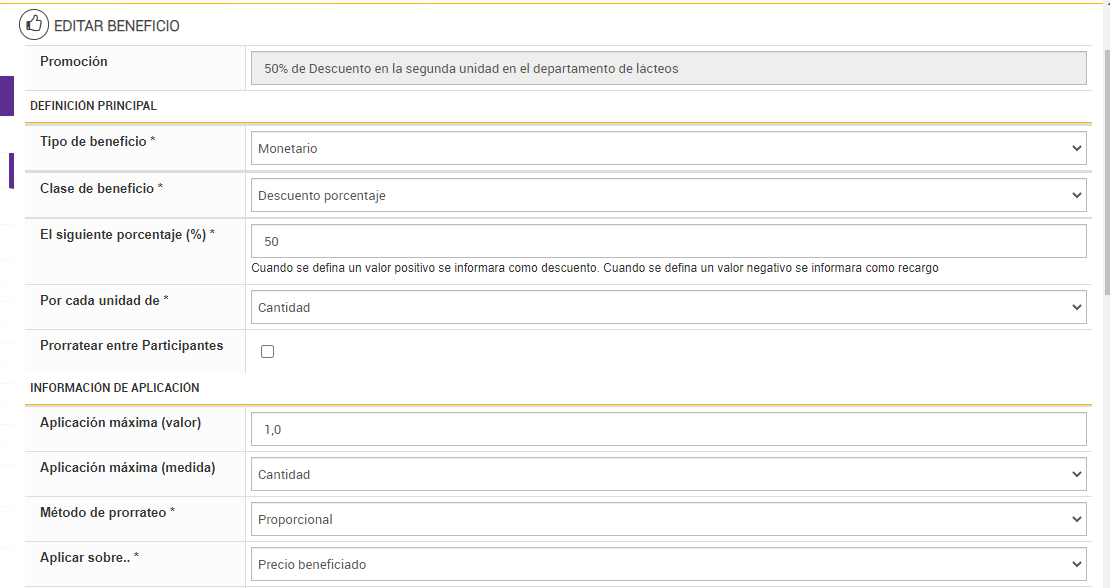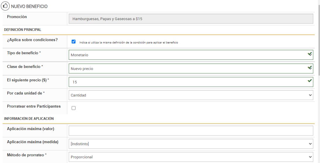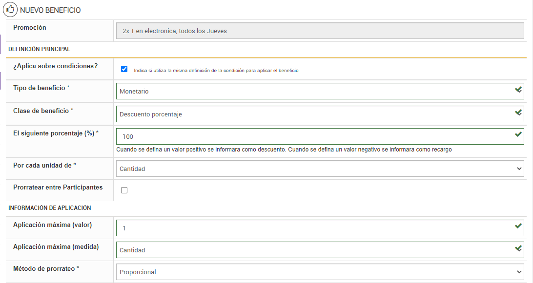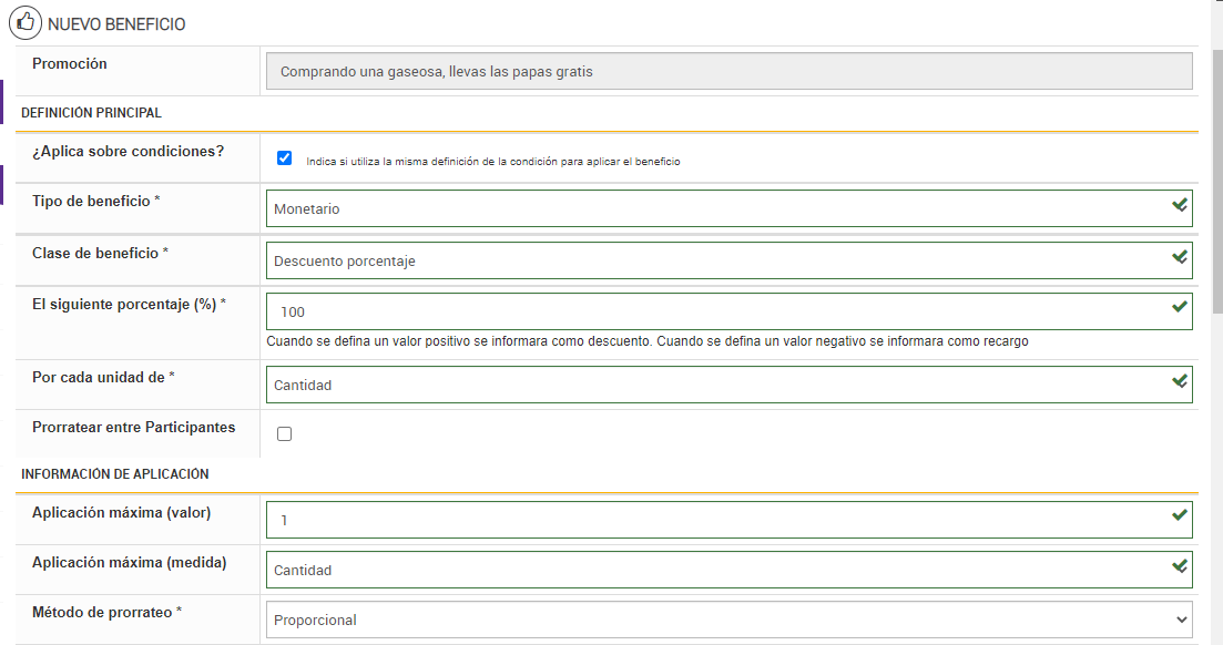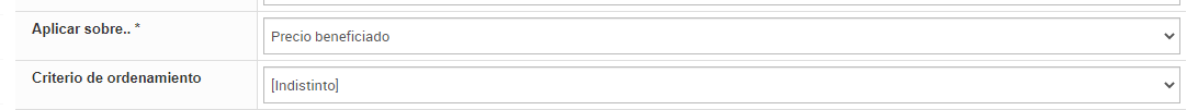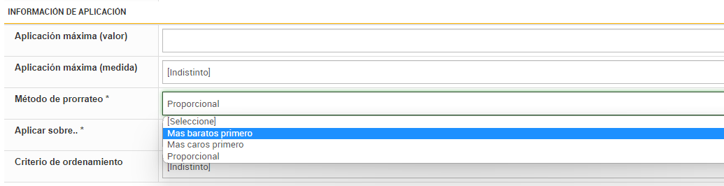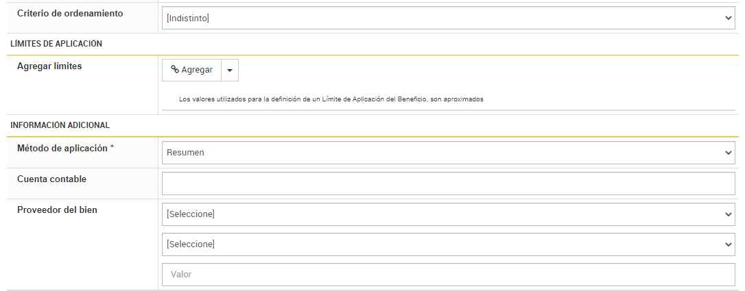 En caso de que se requiera acotar aun mas la aplicación del beneficio podrán especificarse mas datos en los campos "Método de Prorrateo", "Aplica sobre…" y "Criterio de Ordenamiento".