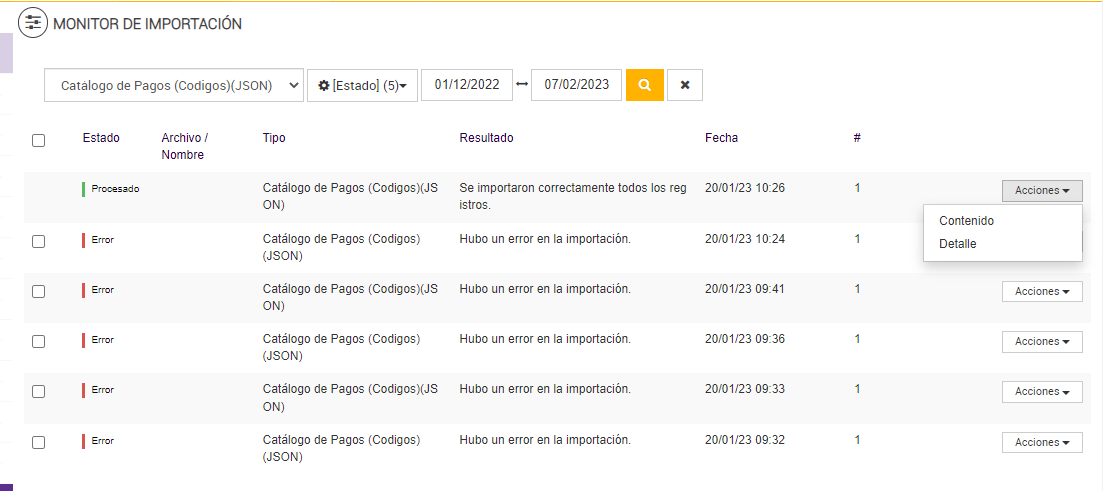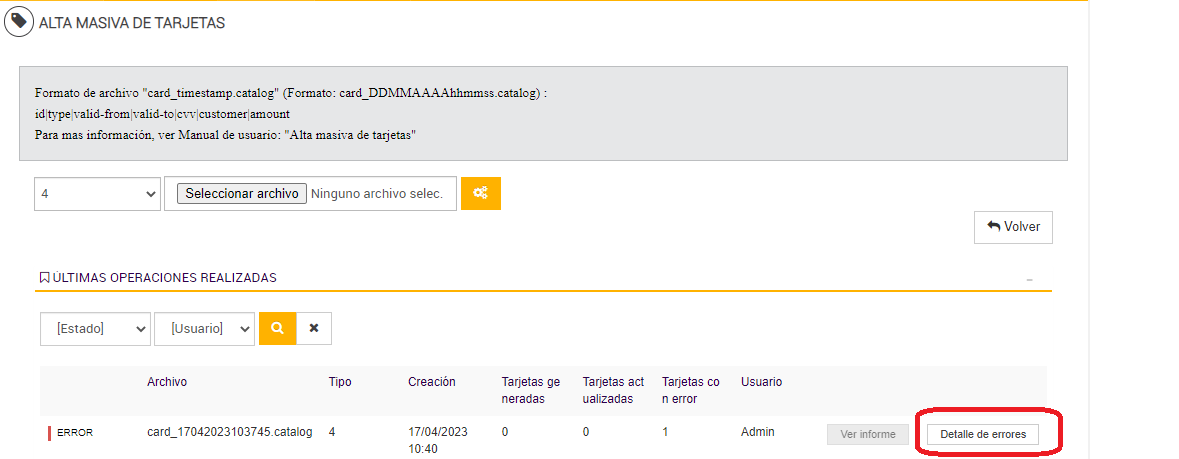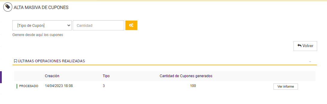 En el mismo banner, se presenta el link de "Ver Detalle", con el cual, podrá accederse a la pantalla donde se encontrara el botón "Procesar Cupones Electrónicos", así como también el código y tipo de cupón y código de error que deberá informarse al administrador para que chequee lo sucedido.