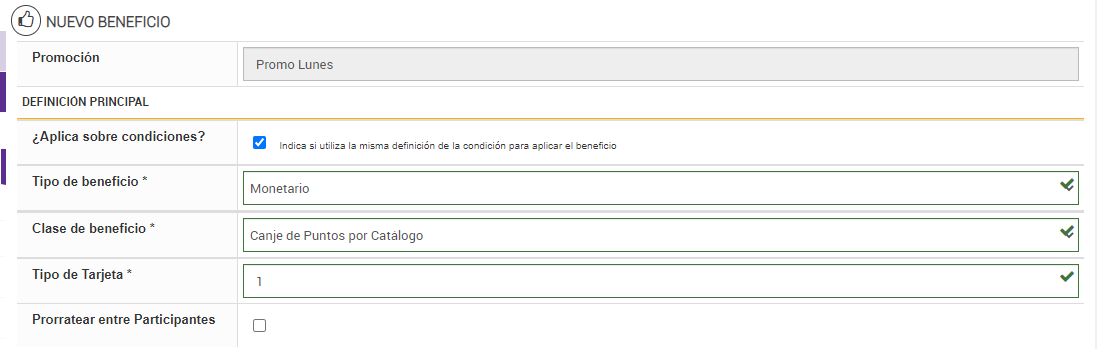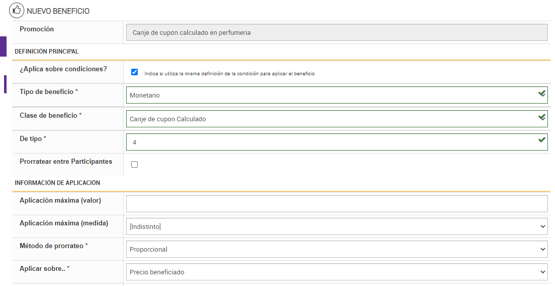 Deberá presionarse en "Nuevo Beneficio", y definirse un beneficio del tipo "Monetario", de la clase "Canje de Cupón Calculado".