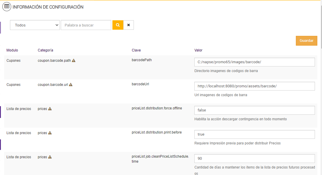 Desde la consola de administración de PROMO también se podrán gestionar y configurar alarmas que servirán de aviso ante determinados eventos, así como también se incorpora el modulo de Precios, con el cual podrán administrarse varias listas de precios para los ítems presentes en la transacción.