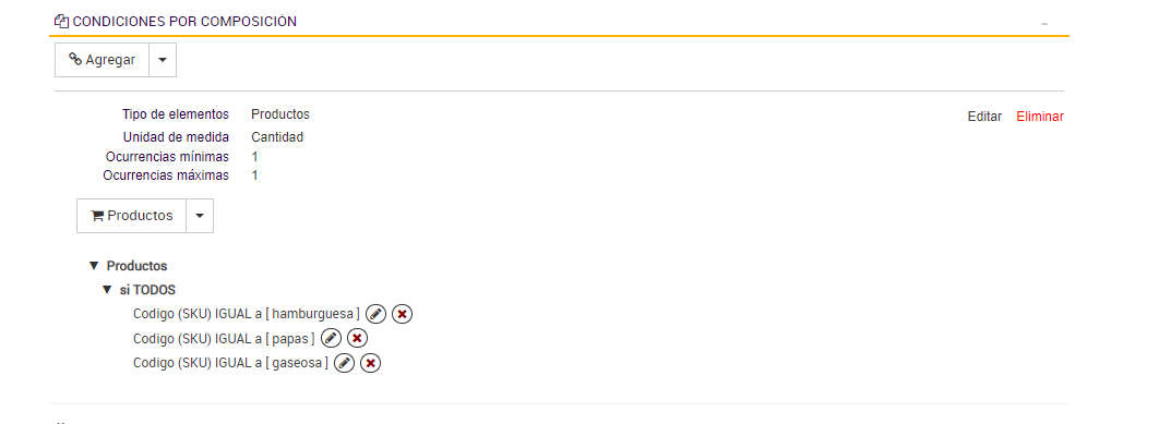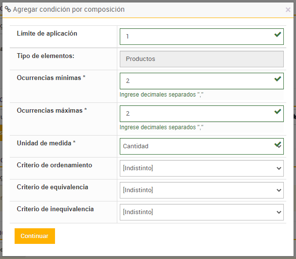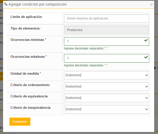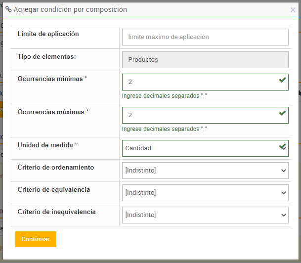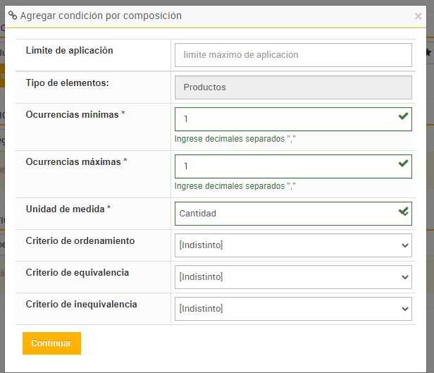 Las tres condiciones por composición tendrán definidas sus ocurrencias mínimas y máximas en 1, indicando en unidad de medida, "Cantidad".