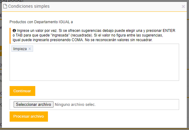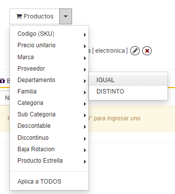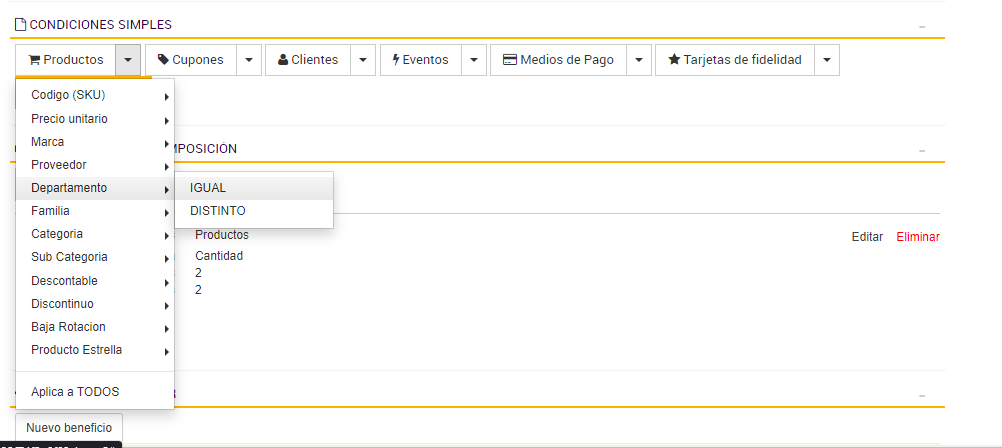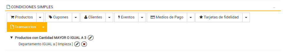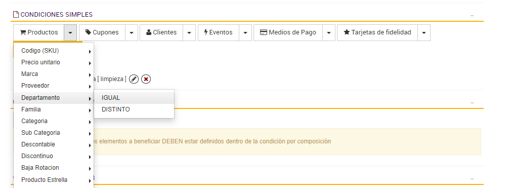 Para ello agregaremos un elemento del tipo producto, en la condición Simple indicando que deberán de pertenecer al departamento de "Limpieza".